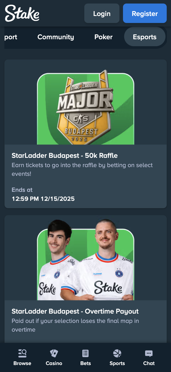 Android and iOS users can download the Stake app to make betting on the go effortless. The in-app experience is smooth, and finding the esports and CS2 odds you want is very easy. Accessing your Stake wallet is also very simple and makes managing your funds a breeze.
